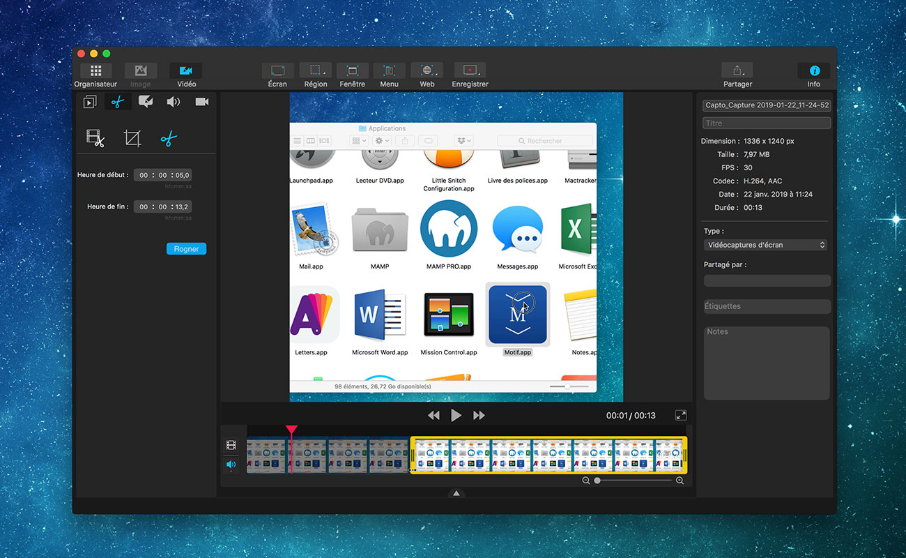 Côté vidéo, Capto déroule la suite d’images composant une vidéo sous la forme d’une timeline. Celle-ci s’affiche en bas de l’aperçu de la vidéo. En haut à gauche, sous la barre d’outils, plusieurs fonctions sont disponibles. Recadrez ou rognez la séquence, ajoutez-lui une annotation (formes, textes, etc.) ou intervenez sur la piste sonore.