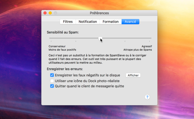 Une fois installé, SpamSieve utilise un puissant filtrage de type Bayésien pour améliorer la précision de la reconnaissance de courriers indésirables. Le logiciel apprend avec le temps.
