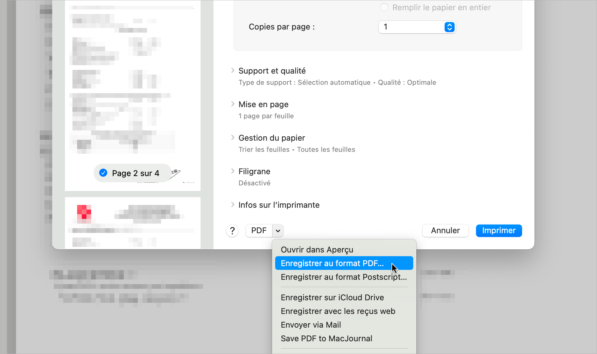 Allez dans le menu Fichier | Imprimer ou utilisez le raccourci [cmd]+[p]. En bas de la fenêtre d’impression, à gauche du bouton Imprimer, cliquez sur le menu PDF.