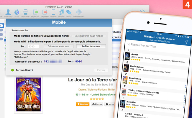 Filmotech est également disponible pour votre iPhone. Si l’application est gratuite, elle affiche une publicité discrète. Il est toujours possible de l’ôter via un achat intégré. Filmotech n’utilise pas iCloud pour synchroniser ses données, et c’est bien dommage. Pour consulter vos films depuis votre smartphone, ouvrez tout d’abord l’application sur votre Mac. Cliquez sur Mobile dans la barre d’outils. Cliquez sur Suivant. Cliquez sur Démarrer le serveur. Depuis l’iPhone, ouvrez l’application. Tapotez l’icône regroupant deux appareils iOS en bas de l’écran. Saisissez l’Adresse IP et le Port tels qu’ils s’affichent depuis la version Mac. Tapotez Télécharger la base. Notez que Filmotech mobile est surtout dédié à la consultation (4). Par exemple, il ne sera pas possible de créer des fiches depuis l’appareil. Si vous appréciez le travail de qualité réalisé par Pascal Pluchon, pensez à lui faire un don depuis son site.