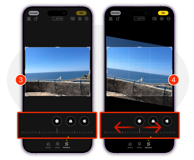 En le glissant à gauche ou à droite, l’angle de la photo est modifié (4). La grille de composition s’affiche durant l’opération. Servez-vous de ses lignes horizontales et verticales pour redresser l’image (5).