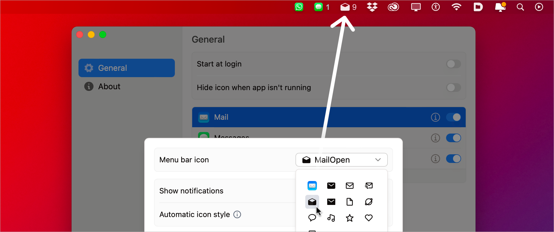 Un simple clic sur cette icône ouvre l’application d’origine, ici il s’agit de Mail. Si vous souhaitez une icône plus discrète, c’est possible. Pour ouvrir les réglages, effectuez un clic droit sur l’icône. Sélectionnez Badgeify Settings. Dans General, cliquez sur (i) à droite du nom de l’application.