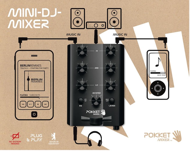 C’est encore lors d’un détour dans les allées de la récente Musikmesse de Frankfurt que nous avons découvert ce petit produit original. Il s’agit d’un mixeur de poche, le Pocket Mixer, au format voisin d’un boîtier de disque dur USB. Le fonctionnement est on ne peut plus simple, deux entrées sur mini-jacks stéréo situées sur le dessus de l’appareil, réparties des deux côtés, au centre une sortie pour un ampli de puissance, une chaîne stéréo ou une paire d’enceintes multimédia et, à l’opposé, une sortie casque. L’idée : vous êtes plusieurs et vous disposez d’au moins deux lecteurs de fichiers audio (iPhone, iPad, lecteurs MP3) et souhaitez partager votre musique à une assistance ou plus simplement, animer une soirée comme DJ de circonstance. Un potentiomètre horizontal (crossfader) permet de favoriser l’un ou l’autre des lecteurs ou de mixer l’audio entre les deux. Un inverseur active un égaliseur trois bandes, chacune ajustable par le biais de trois boutons. Enfin, un commutateur autorise l’envoi de l’audio d’un des lecteurs dans le casque, histoire de choisir le prochain morceau à lancer (pré écoute). Mais, en dehors de sa taille, qu’a t-il de plus qu’un autre mixeur ? Et bien, il est statique, ce qui signifie qu’il n’a nul besoin d’énergie pour fonctionner, ni batterie, ni pile, ni rien ! Pour l’avoir écouter in situ, il semble ne pas y avoir de détérioration des signaux originaux, certainement grâce à un choix judicieux des composants. Le Pocket mixer est disponible par achat en ligne au tarif de 89,95 €, plus d’informations sur le site du fabricant.